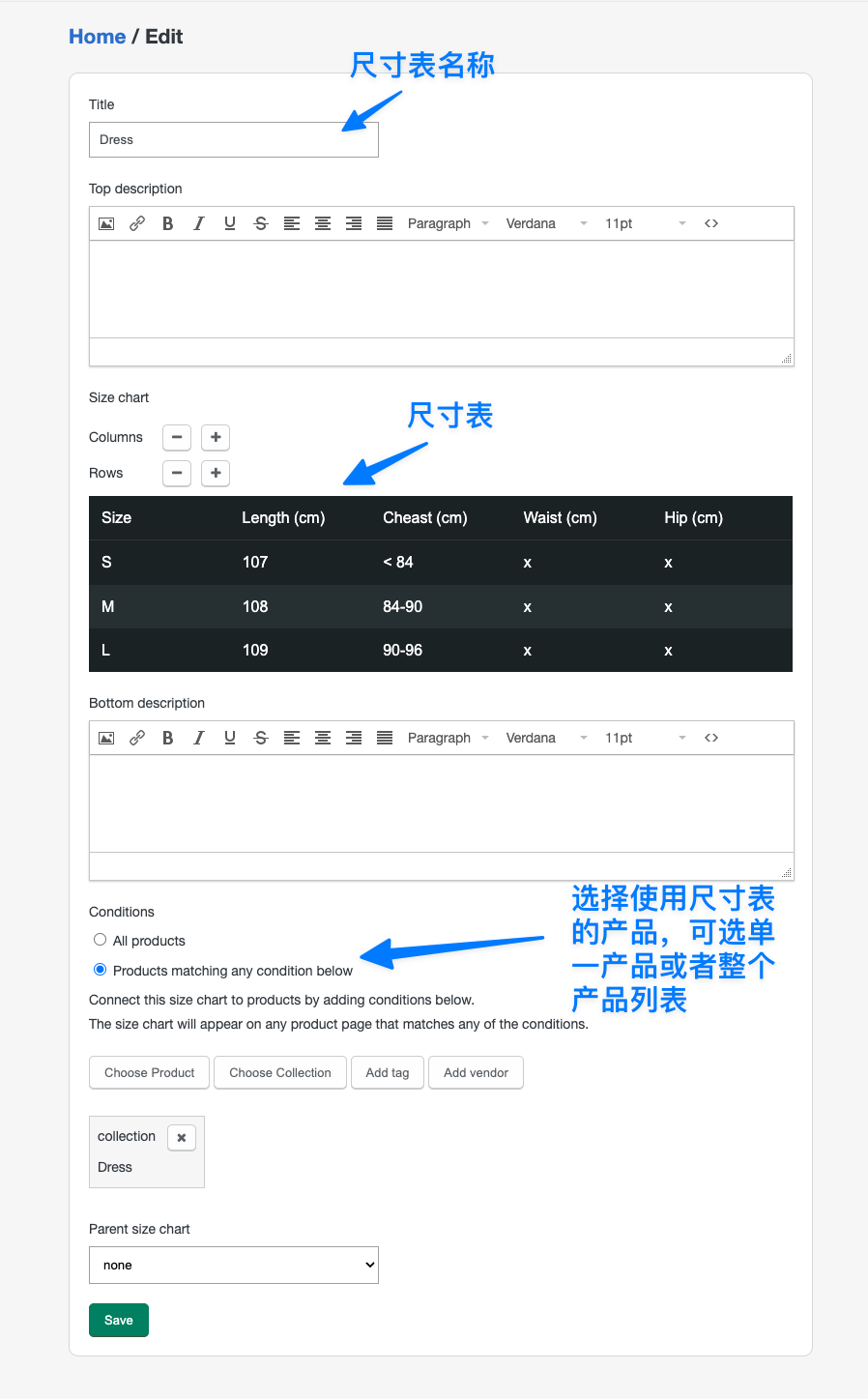 - 在BF Size Charts里面创建新的尺码表,可以直接用表格或者在Top Description插入图片。