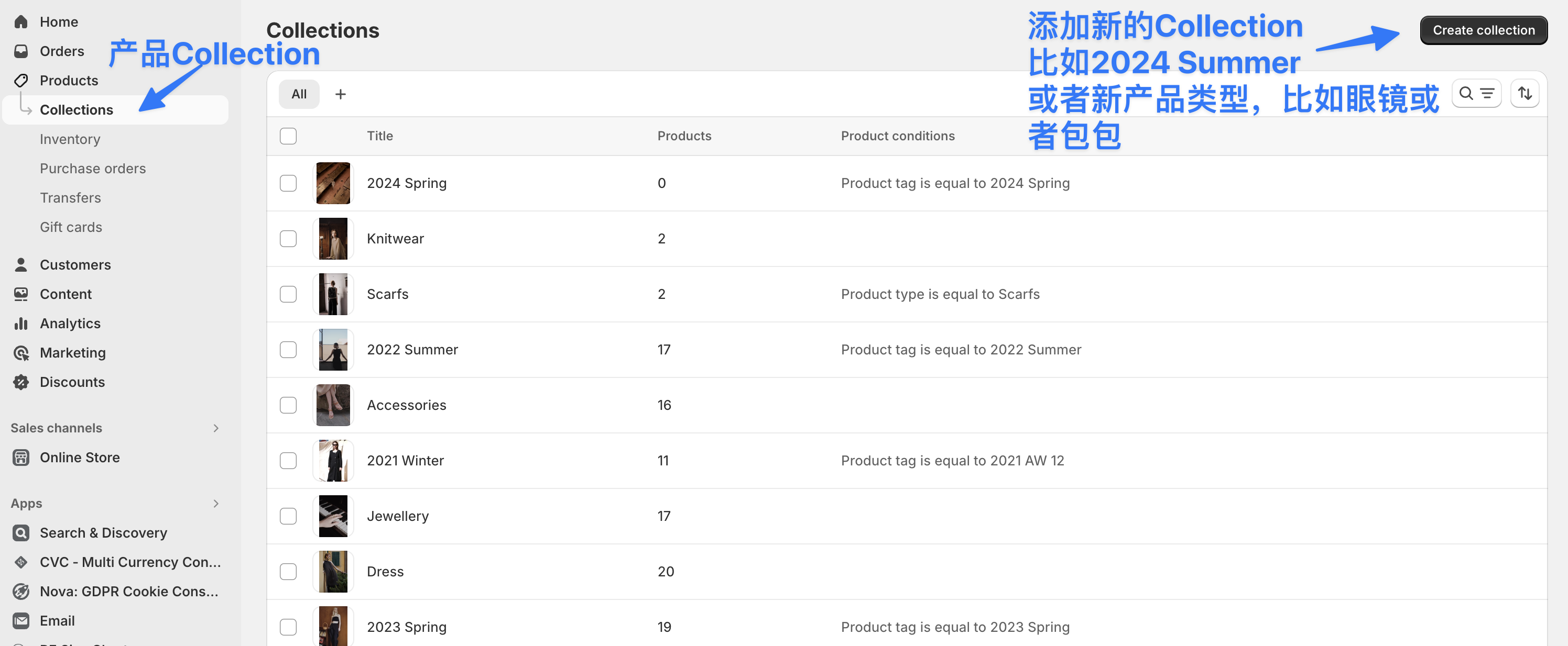 - 产品上新可用标签(Tags)来分类, 比如2024 Spring, 2023 Winter