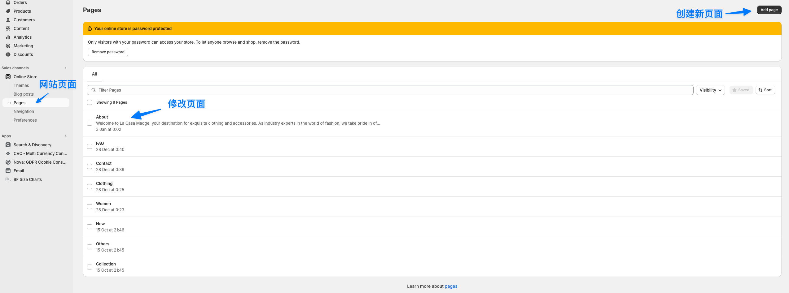 - 导航到页面管理:在 Shopify 后台,导航到“Online Shop” > “Pages”。