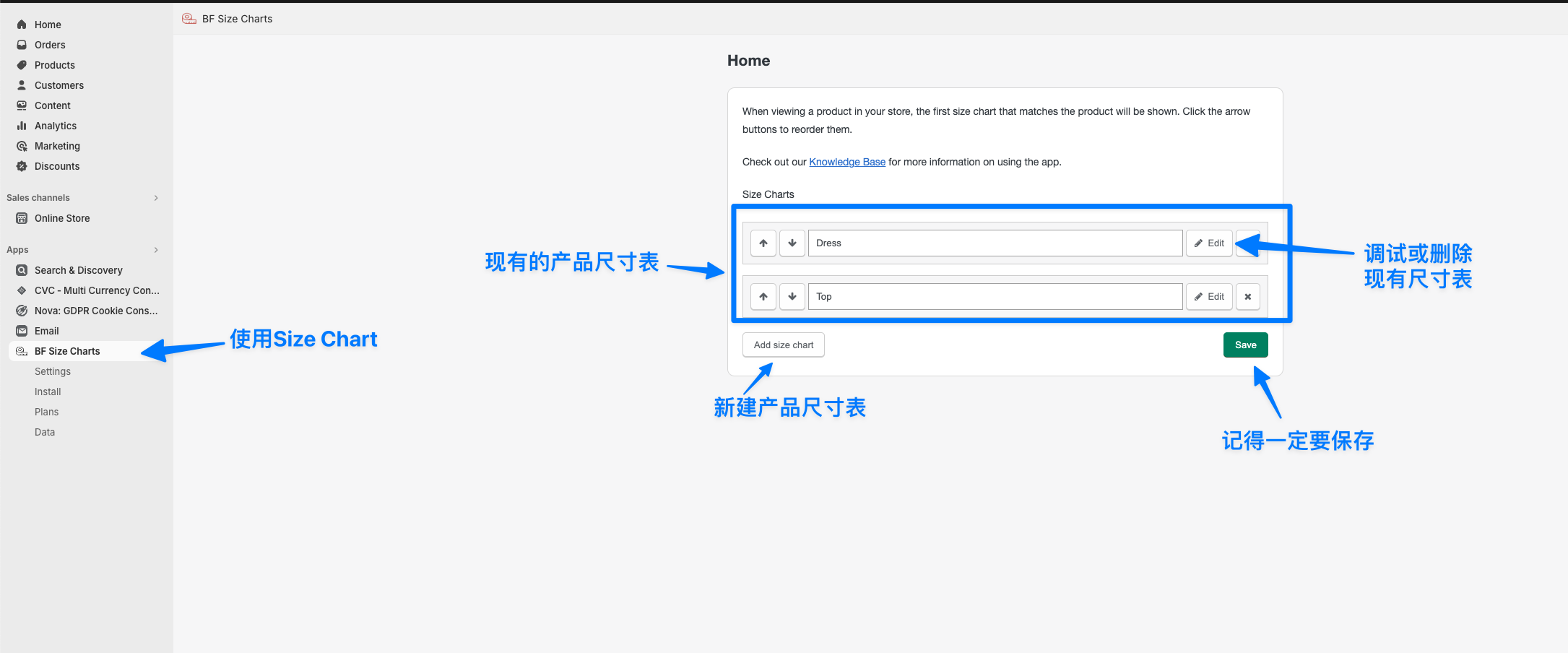 - 在BF Size Charts里面创建新的尺码表,可以直接用表格或者在Top Description插入图片。